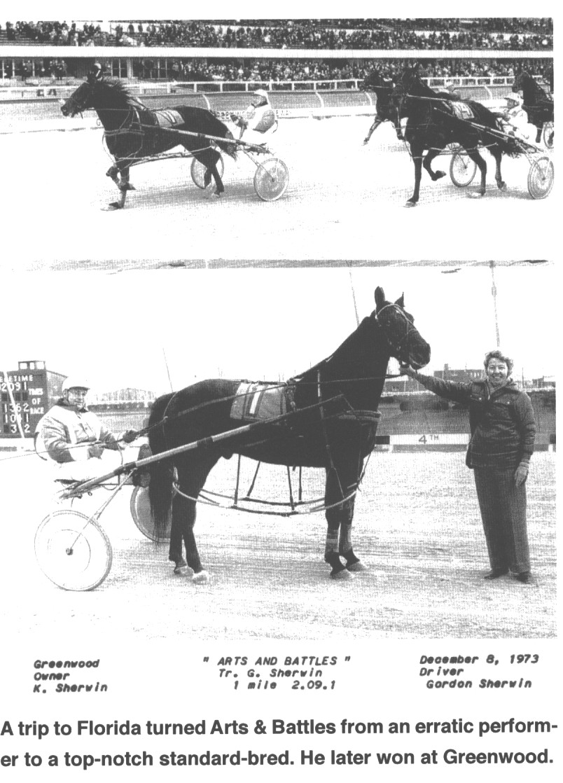 While Gord frequently raced the horse himself, he would also call on Doug Hie to race him. Doug had a stable, track and exercise pool, which was a helpful tool in training horses without placing· so much stress on their tendons. Arts & Battles had suffered from tendon problems from an early age, and never seemed to achieve his potential - at least until Hie offered to take him on the Florida circuit one winter in the early '70s. Hie entered him in a lower-level competition at Pompano Park, and the horse won. Hie entered him again, and again Arts & Battles took the field.
