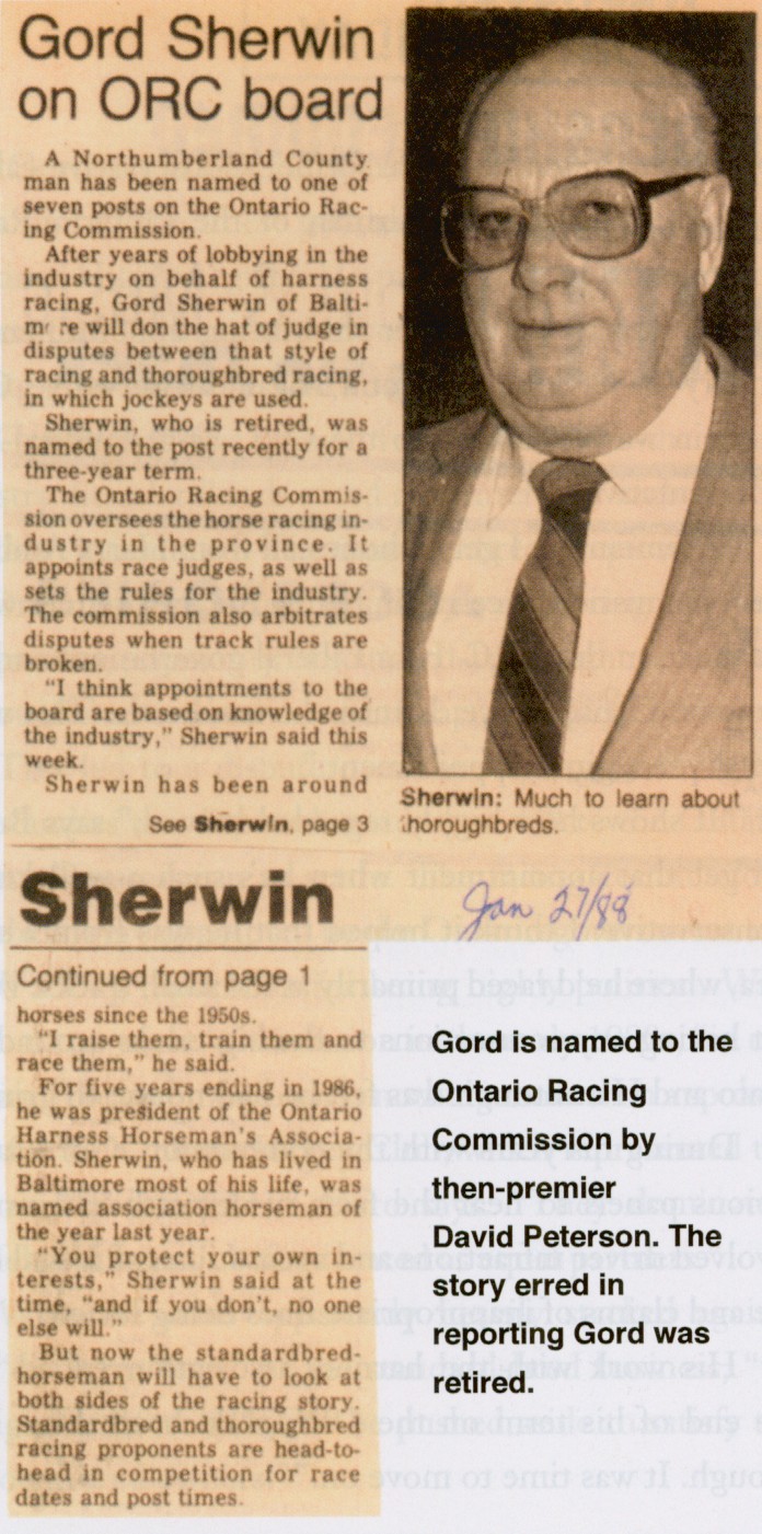 Peterson had already made former Tory labour minister Robert Elgie a member of the Workers' Compensation Board. Then he made former Conservative Cabinet Minister Frank Drea chairman of the Commission. He also made another interesting appointment. In January 1988, long-time and vocal Conservative Gord Sherwin was appointed to the ORC as a standardbred representative.